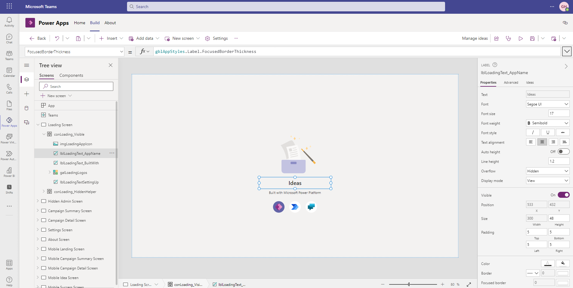 When editing the app, you can modify whatever you want or extract parts of it that you want to reuse in your own Power App development. This is were things can get difficult: The Power Apps studio is not like VS Code. There’s no way to jump to for example the definition of a variable to inspect it and see what’s really behind it. You need to find where the variable is declared yourself. In the screenshot below, we see that the styling of the Ideas label for property FocusedBorderThickness is coming from: