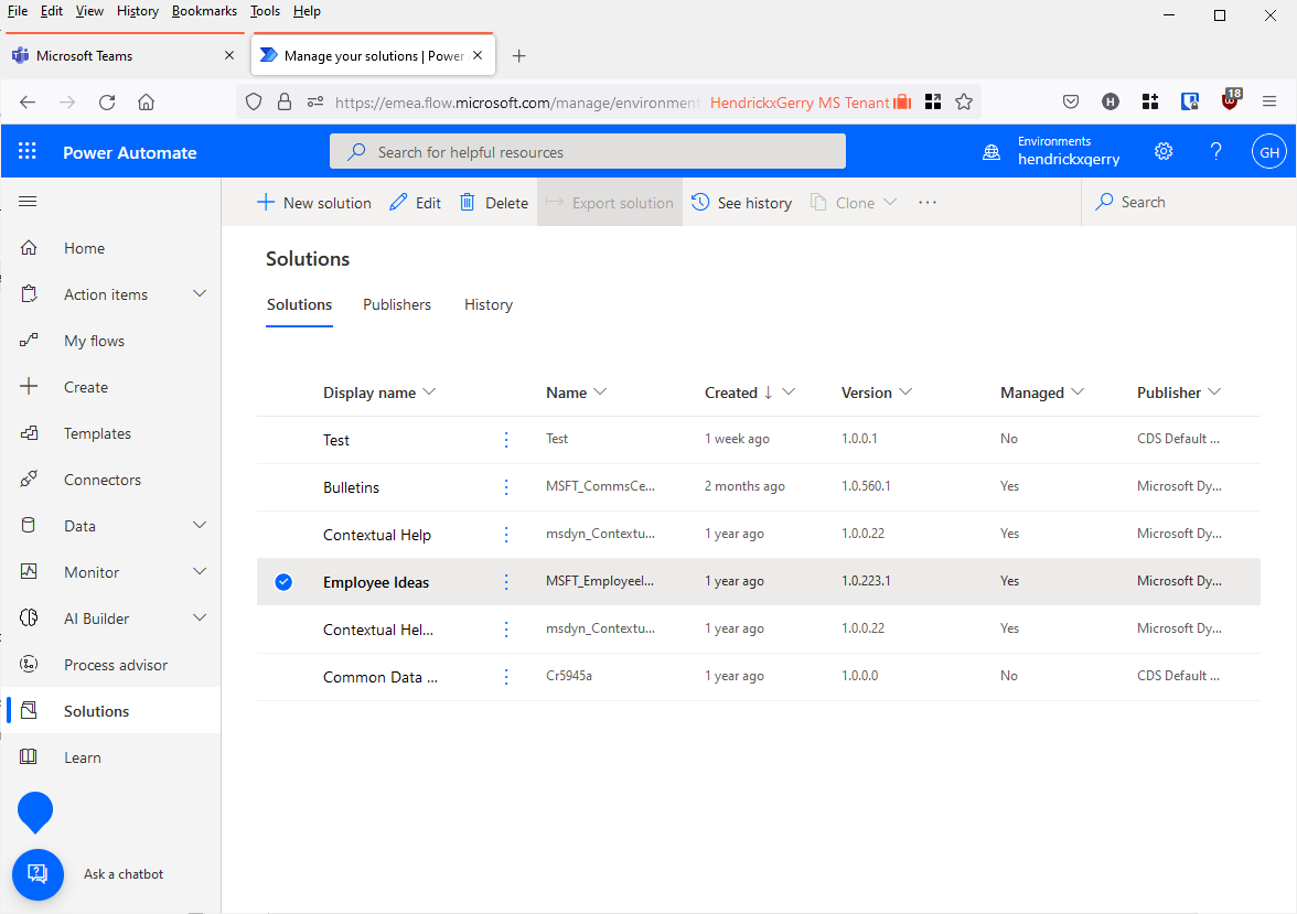 So I wanted to download the Employee Ideas solution and unpack it to open it in VS Code. I’ve read before that Dataverse for Teams apps do exist in their own solution, but for some weird Microsoft logic, they’re only visible in the Solutions section of the Power Automate Portal. Once you log in to https://flow.microsoft.com you can see your Teams under Environments in the upper right corner. Select your Team and go to Solutions. Bingo! The Employee Ideas solution is there. However, the sample apps are installed as Managed Solution, and we’re not able to export these. Only unmanaged solutions can be exported.