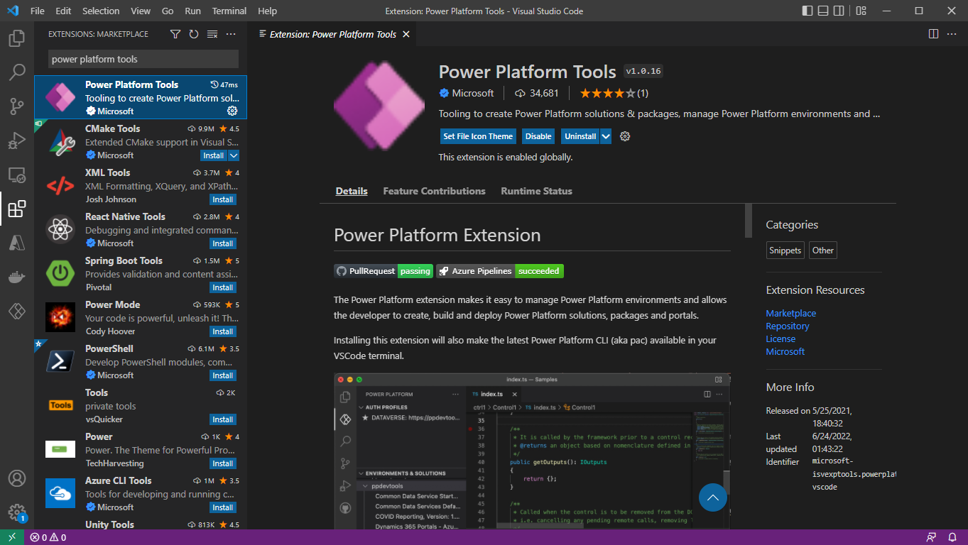VS Code is a very lightweight and extensible code editor. Microsoft has created an extension called Power Platform Tools that contains a CLI for managing Power Platform assets. You can install it through the extension menu of VS Code.