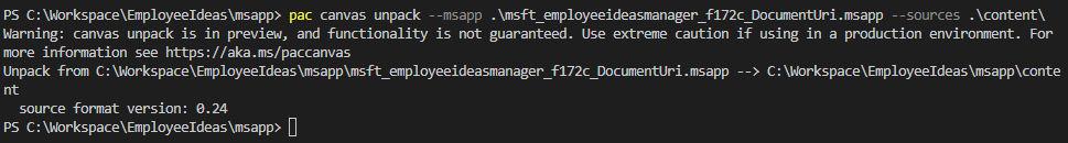 Once installed, you can use the terminal in VS Code to unpack a *.msapp file. Put the file in a folder and browse to that folder in the terminal. Use the following command to unpack the file, with the name of the msapp file and a link to a directory where the unpacked version needs to be stored: