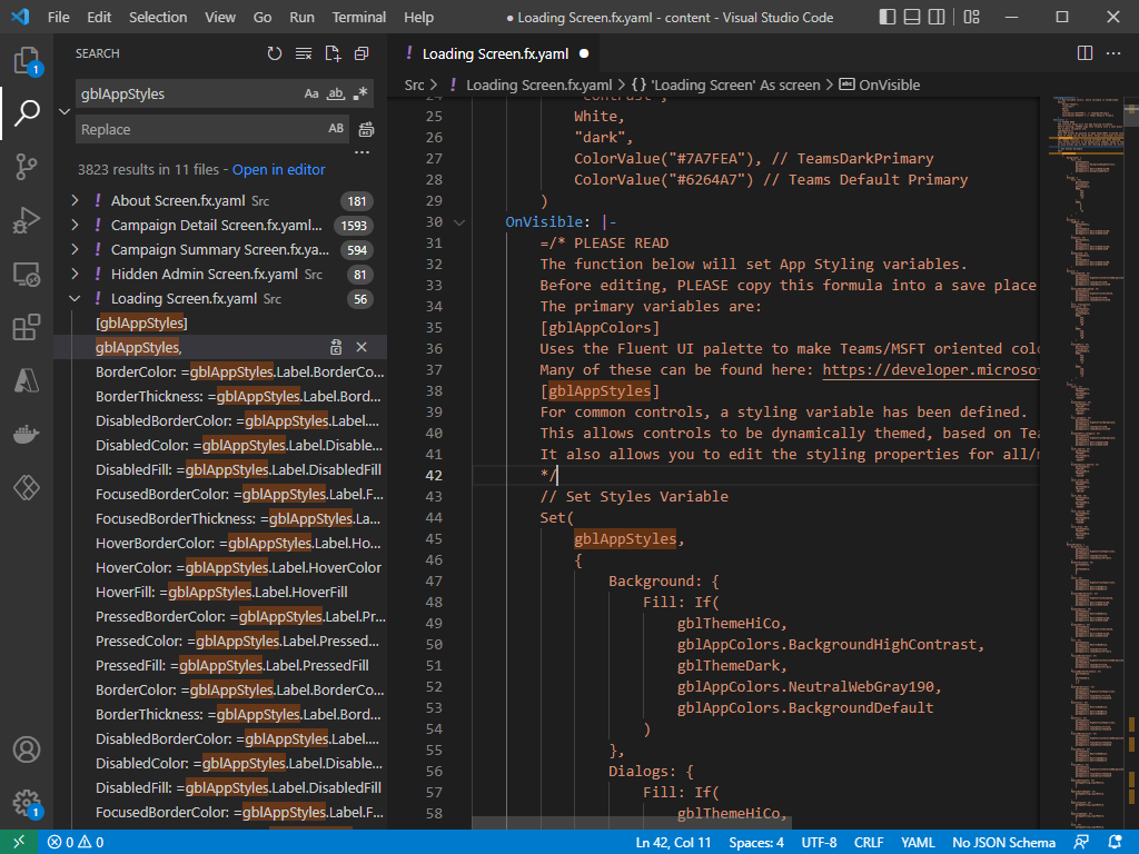 Now, you can easily use the VS Code search functionality to look for any variables that you weren’t able to find back in the Power Apps Studio. In our example, let’s look for the gblAppStyles variable. We can see that the variable is defined in the OnVisible property on the Loading Screen.