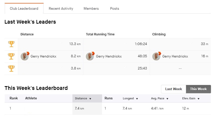 The dashboard on Strava for clubs is limited. It only shows you the graph of everyone’s current week progress, and a leaderboard for the previous week. You can see an example of this below.